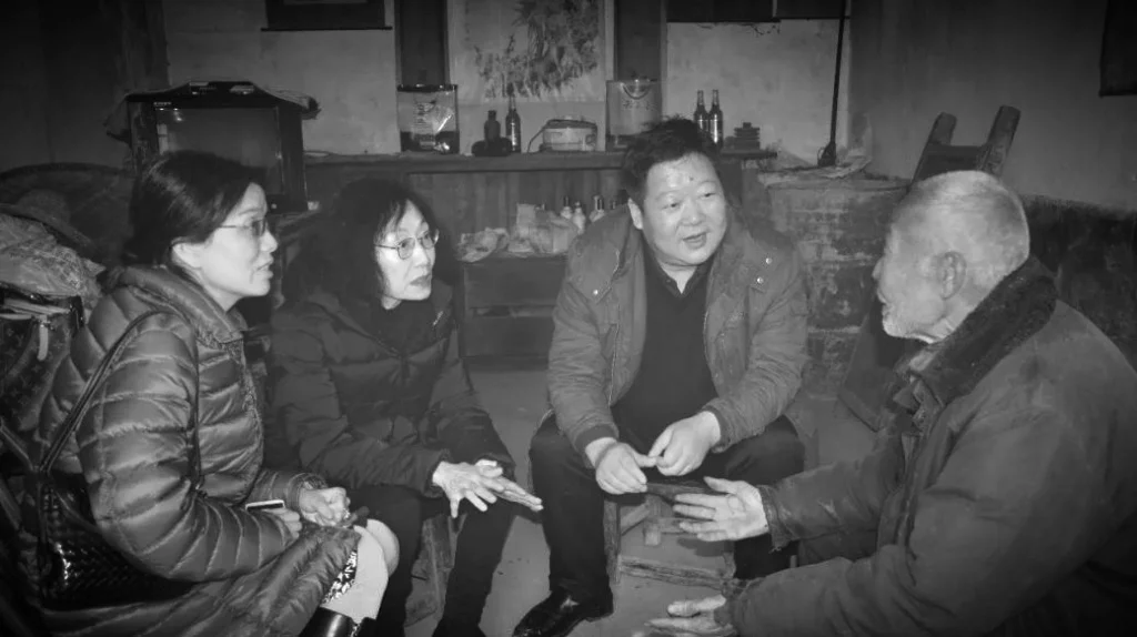 ↑ Jin Wang, CEO of ShanCha Inc. and professor Christine Choy of NYU visiting farmers in the company of Mr. Han, the head of local bureau of cultural relics